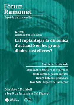 Aquest dissabte tindrà lloc la primera tertúlia del Fòrum Ramonet, un espai de debat casteller impulsat per un grup de veterans dels Castellers de Vilafranca. El tema que debatran aquest dissabte: ‘Cal replantejar-se la dinàmica d’actuació en les grans diades?’, conduït per el periodista casteller Pep Ribas (@pepribes) i amb la participació de: Jordi Betran, Joan Sala, Ricard Rafecas i Toni Bach @tonidelloret A les 6 de la tarda, a cal Figarot, local dels Castellers de Vilafranca.